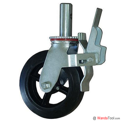 SCAFD系列脚手架脚轮,采用杆径38mm,长100mm的实心圆杆装配。根据所配套轮子材质的不同,单个脚轮设计载荷从200 公斤*500 公斤不等,主要应用于脚手架系列产品。这款脚手架脚轮上珠盘采用齿状的刹车设计,配套于脚手架安装使用时,可以同时牢靠的锁定轮子和支架的转动,有效保证了脚手架使用时的安全。